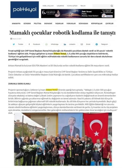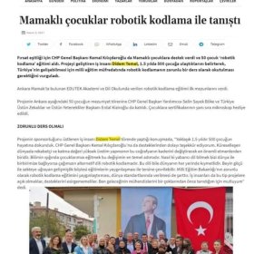 Fırsat eşitliği için CHP Genel Başkanı Kemal Kılıçdaroğlu da Mamaklı çocuklara destek verdi ve 50 çocuk ‘robotik kodlama’ eğitimi aldı. Projeyi geliştiren iş insanı Didem Temel, 1.5 yılda 500 çocuğa ulaştıklarını belirterek, Türkiye’nin gelişebilmesi için milli eğitim müfredatında robotik kodlamanın zorunlu bir ders olarak okutulması gerektiğini vurguladı.